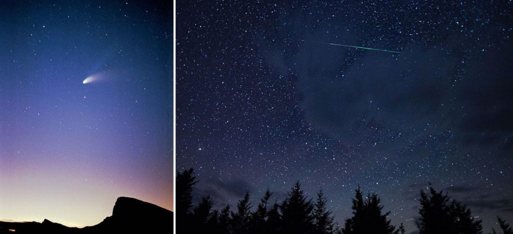 Left: Hale-Bopp Comet; Right: shooting star during a Perseid Meteor Shower