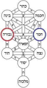 The “Tree of Life” depicting the Ten Sefirot, with Chessed and Gevurah in blue and red (respectively)