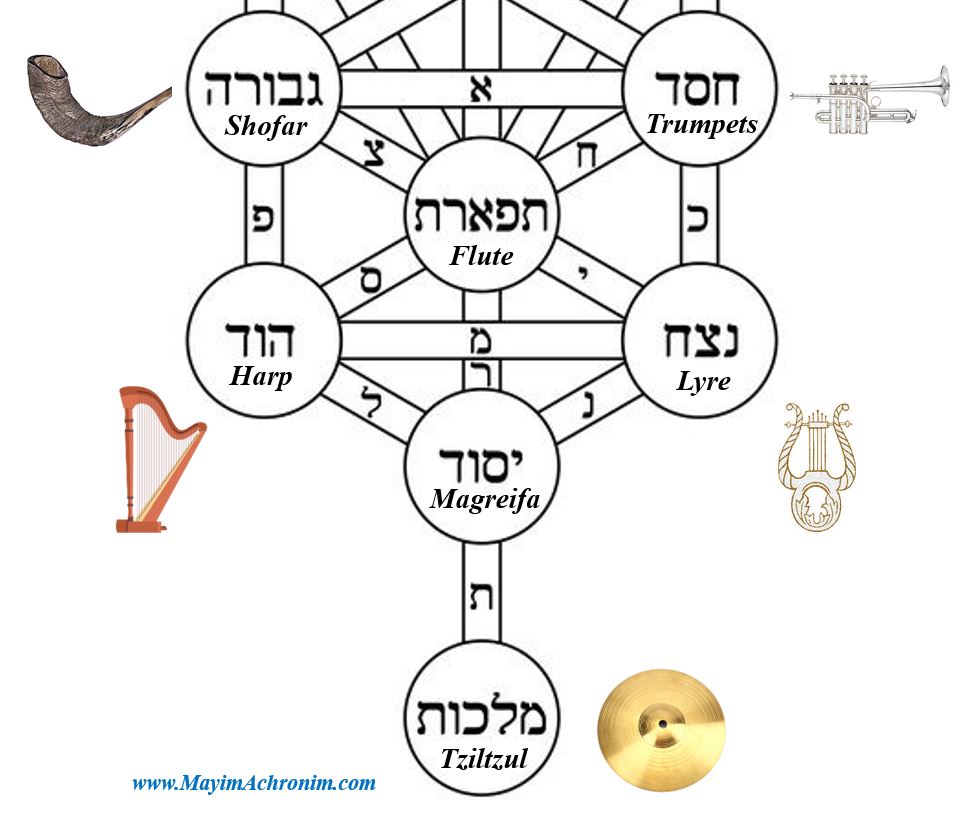 Altogether, we find a total of seven instruments used in the Temple: the trumpets (hatzotzrot) and the shofar, the lyre (navel), the flute (halil), and the magreifa, plus the harp (kinor) and the cymbal (tziltzul). The latter is the only percussion instrument, and parallels the timbrel (tof) mentioned in Psalm 81:3 as one of the instruments used on the holidays. These neatly parallel the seven lower Sefirot (which themselves parallel the seven musical notes):