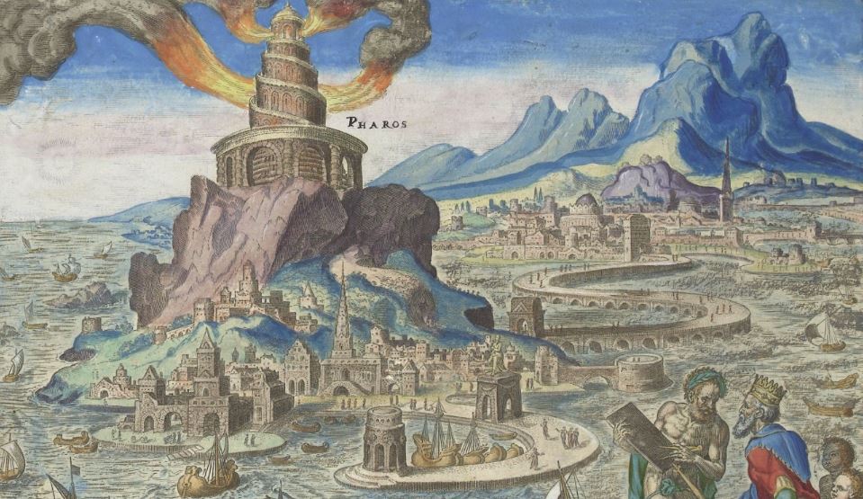 A 1572 sketch of ancient Alexandria, highlighting the pharos, the city’s world-famous “Great Lighthouse”.