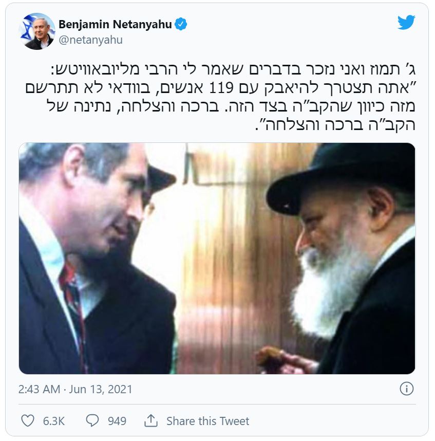 Aside from rightfully commemorating the Rebbe’s yahrzeit, the tweet had a political message, too, implying that God was on Bibi’s side and suggesting that he would continue to battle the other 119 members of the ungodly Knesset. Of course, as we have seen, the Rebbe never said specifically that God was on Bibi’s side. The Rebbe was extremely careful with his choice of words; if he had wanted to say that God was on Bibi’s side, he would have.