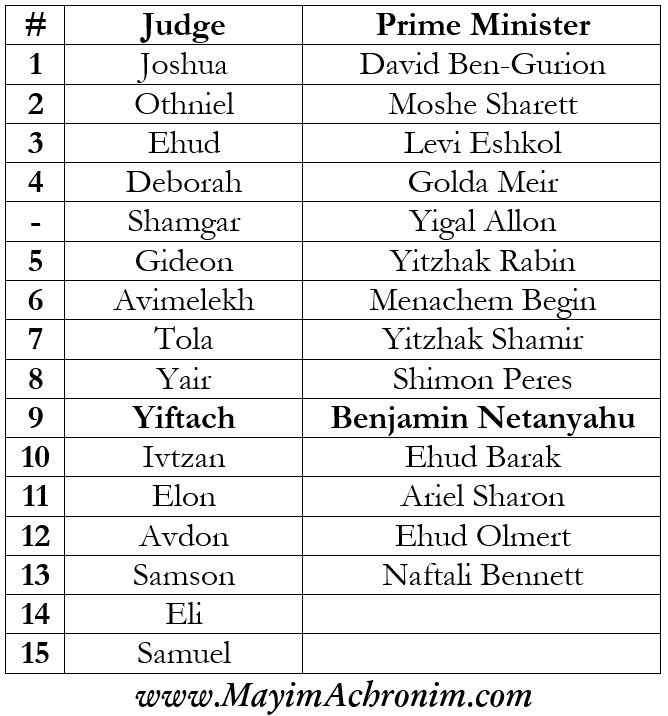 Based on this hypothesis, the prime ministers of Israel would correspond to the ancient Judges in the following way: