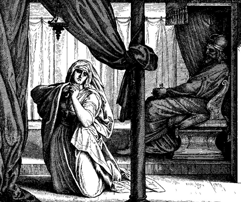 The spies told her to hang a scarlet thread on her home as a sign for the Israelite forces to spare her household. Rachav went on to convert and join the Jewish people, and even married Joshua! The Tanakh calls her a zonah, generally translated as “harlot”, but many of our Sages interpreted the term in the sense that she actually had a bakery and provided mazon, “sustenance”. In Yalkut Shimoni (on Yehoshua 9) it is said that she really was a harlot (from the age of ten, no less) and finally gave up her sinful ways at the age of fifty, inspired by the Israelites arrival. She repented so thoroughly that the mighty Joshua himself married her, and from them descended eight great prophets and priests of Israel: Jeremiah and his father Hilkiah, Seraiah, Baruch and his father Neriah, Hanamel, and Shallum (see also Megillah 14b).