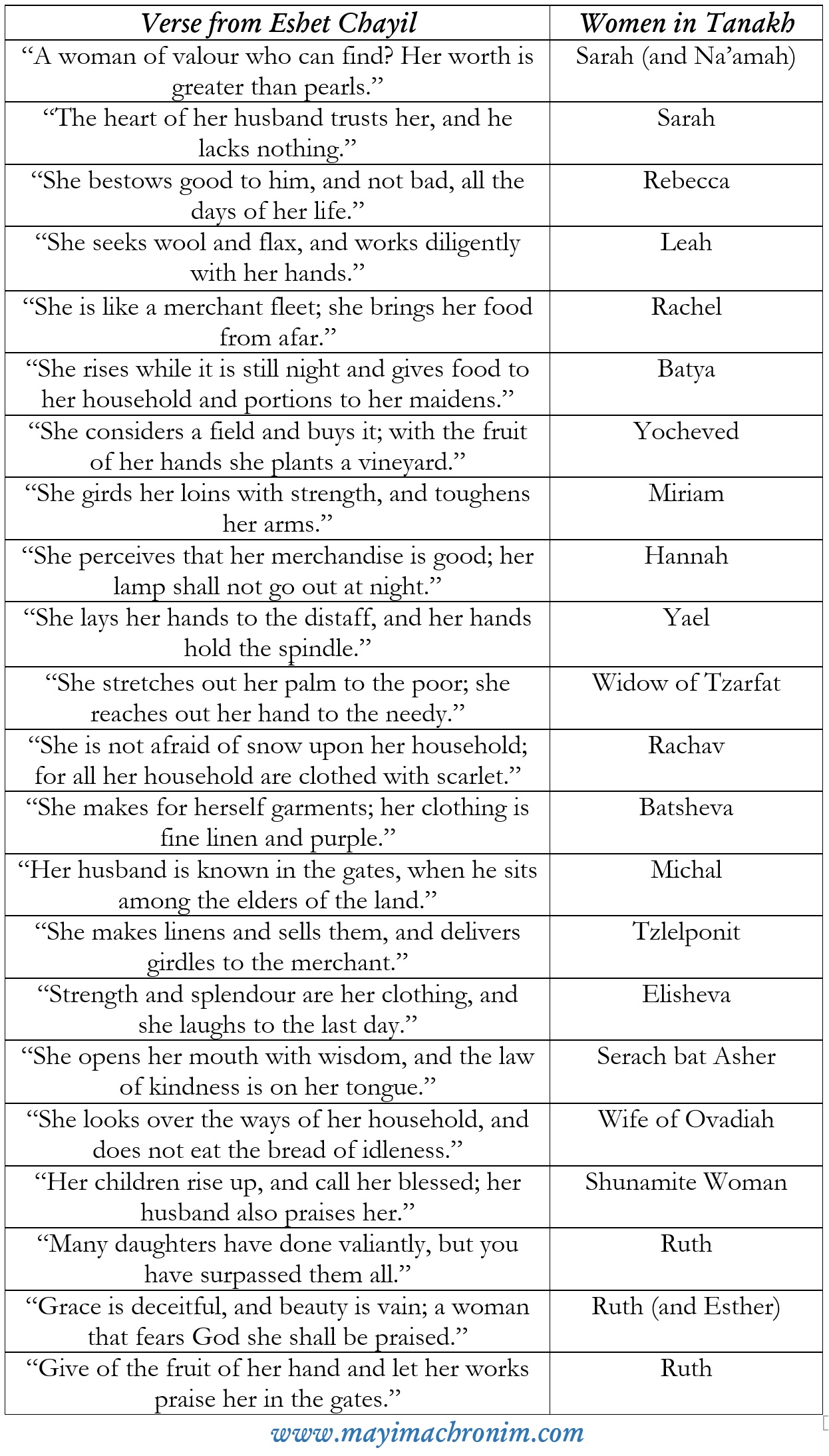 The Midrash concludes with three lines for Ruth who, as mentioned, is the only woman to be explicitly called an eshet chayil in the Tanakh.