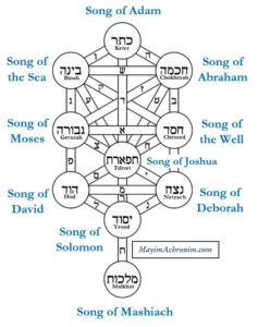 This list of Ten Songs of Israel parallels the Sefirot just as well as the previous list: the first three were sung nationally by all of Israel, and correspond to the higher three Mochin. The remaining seven were composed and sung by individuals, corresponding to the lower seven Middot. (The above diagram remains nearly the same, except that the Song of the Well—also representing the wellsprings of Wisdom—moves up to Chokhmah to make way for Hannah’s Song, describing God’s everlasting Chessed. And the first Song of Adam is replaced by Israel’s first, the Song of the Exodus).