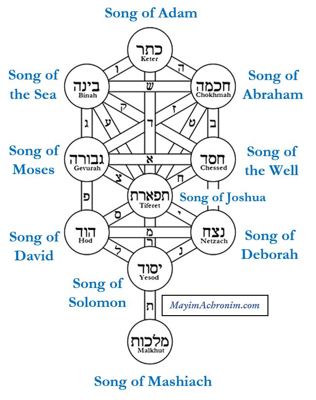 One can easily see how the above ten songs neatly correspond to the Ten Sefirot, in perfect chronological order. The first song to be revealed, the Song of Adam, is the first Sefirah of Keter, the initial Divine Will (and corresponding to the highest world of Adam Kadmon). It is all about Shabbat, “last in Creation, but first in thought” as we say in Lecha Dodi. Then comes the Song of Abraham, our first forefather, corresponding to Chokhmah, or Abba, the “father” Sefirah. Abraham was the first true chakham, the first to go out and teach God’s Wisdom to others. Next is the Song of the Sea, corresponding to the motherly Binah or Ima, and appropriately this is the song described as being prolonged by the ladies, led by Miriam. Binah is often compared to the womb, just as crossing the Sea was symbolically for Israel like the birthing waters of a new nation.
