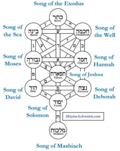 The Song of the Well, of course, corresponds to Chessed, always associated with life-giving water. The harsh Song of Moses is fitting for Gevurah or Din, God’s severity and judgement. The Song of Joshua—stopping the sun to allow for the conquest of the Holy Land—is for Tiferet, always associated with the sun, and with the Land of Israel. Deborah’s Song about another great military victory, with the Eternal One coming to save Israel from oppression, is Netzach. David’s glorious song of gratitude is Hod, and Solomon’s intimate Shir haShirim obviously parallels Yesod, just as the Song of Mashiach obviously ties to Malkhut.