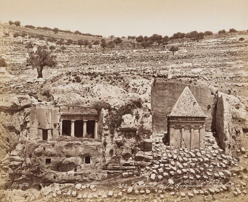 Above: the new building of the Israeli Supreme Court, with the Knesset building in the background. Clearly visible is a pyramid with all-seeing-eye, frequently the subject of many Illuminati conspiracy theories. The official explanation is that the Supreme Court building includes elements of all Jewish and Holy Land history, and this pyramid feature is modeled on the 1st century Tomb of Zechariah uncovered in Jerusalem’s Kidron Valley, an 1870 photo of which is below: