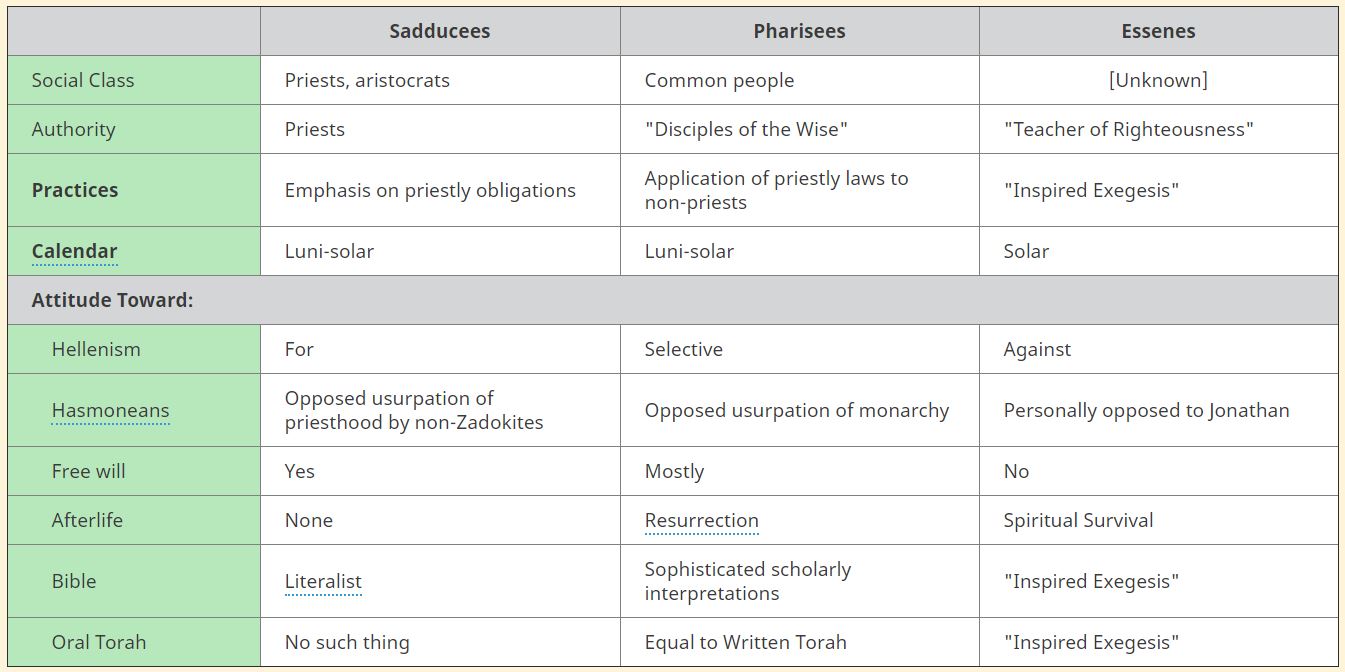 Comparison of Sadducees, Pharisees, and Essenes, from the Jewish Virtual Library.