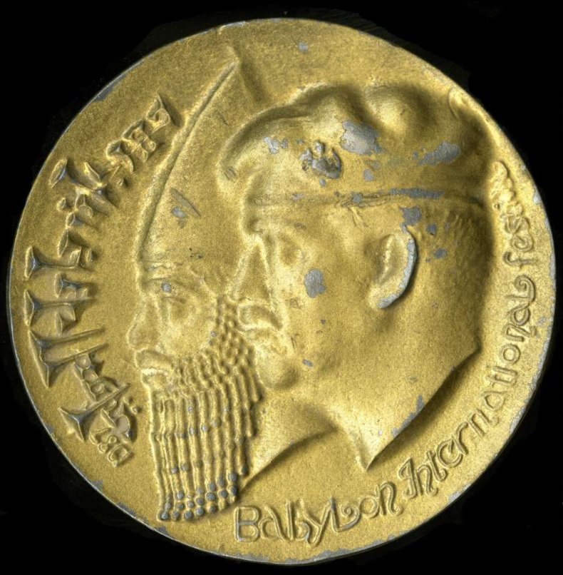 A 1987 gold-plated medal minted by Saddam Hussein, depicting his own face alongside Nebuchadnezzar’s.