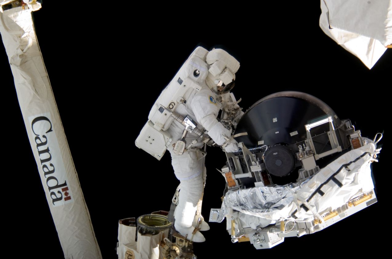 Canadian astronaut Dave Williams installs a new gyroscope onto the International Space Station’s Z1 truss, during a six-and-a-half-hour spacewalk.