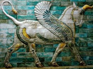 Sometimes (like in Shushan above), the unicorn is depicted with wings, reminiscent of the Greek mythological beast known as Pegasus. The earliest mention of this animal is from the Hittites (the Torah’s Hittim, listed among the tribes in Canaan), who called it pihassas, “lightning-horse”. The majestic winged-horse/unicorn flies down from the clouds, hence the association with lightning. Similarly, the Midrash (Yalkut Shimoni II, 688) records a fascinating story in which the majestic re’em/unicorn lifts David up into the clouds: